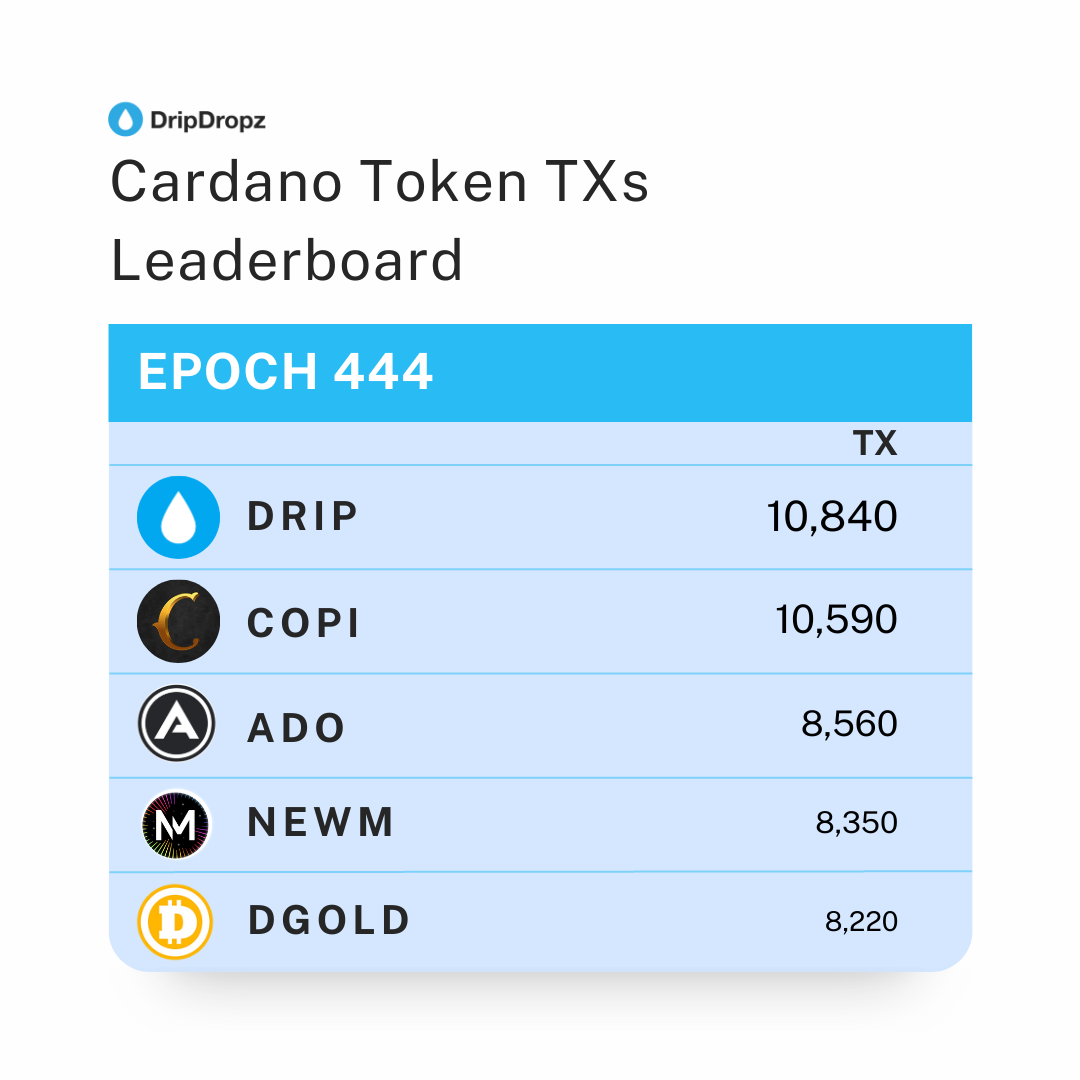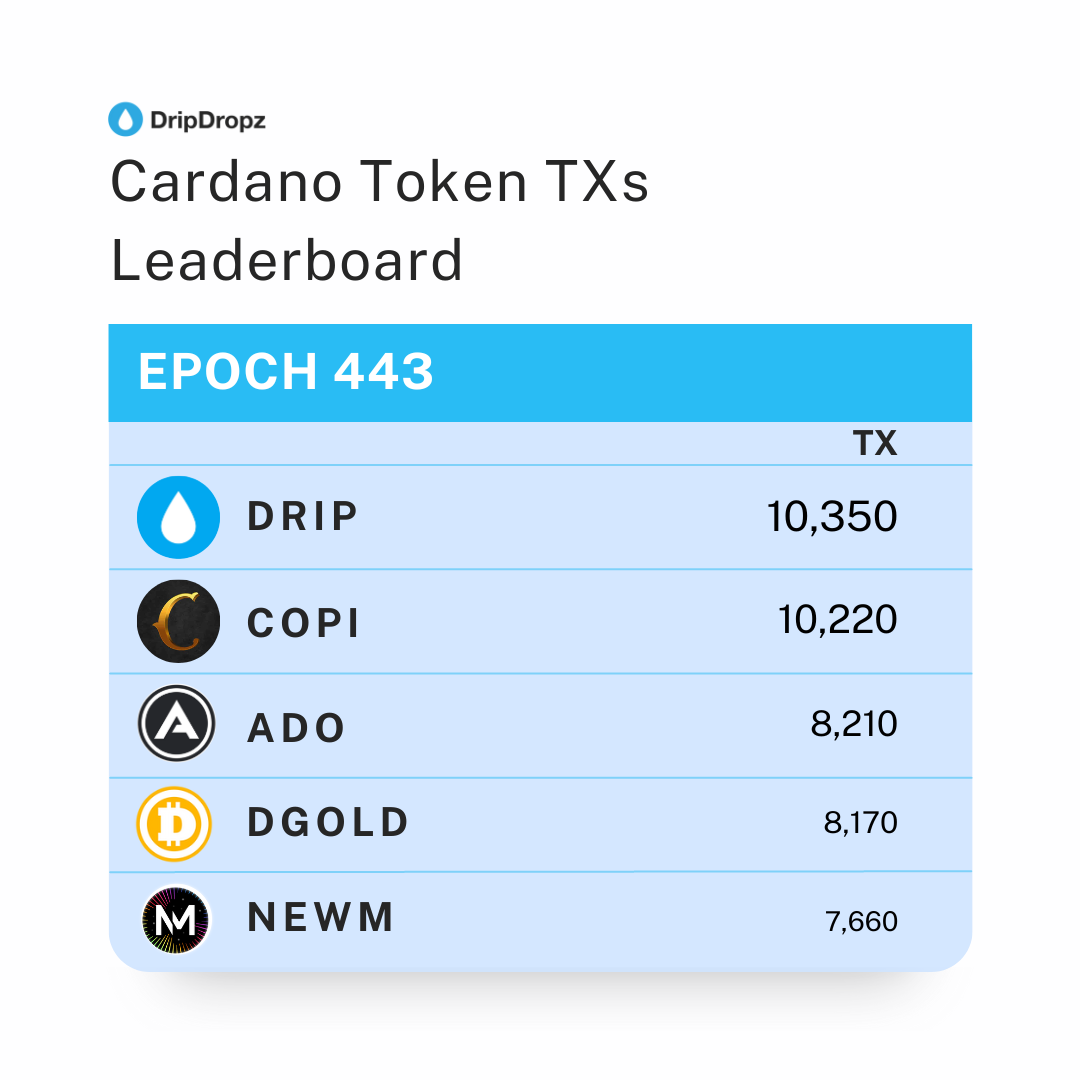 The Cardano universe is expanding at warp speed and epoch 443 signals a new frontier. DripDropz's $DRIP token led the charge with a whopping 10,350 transactions - that's the power of the fastest and most trusted token delivery platform on Cardano.